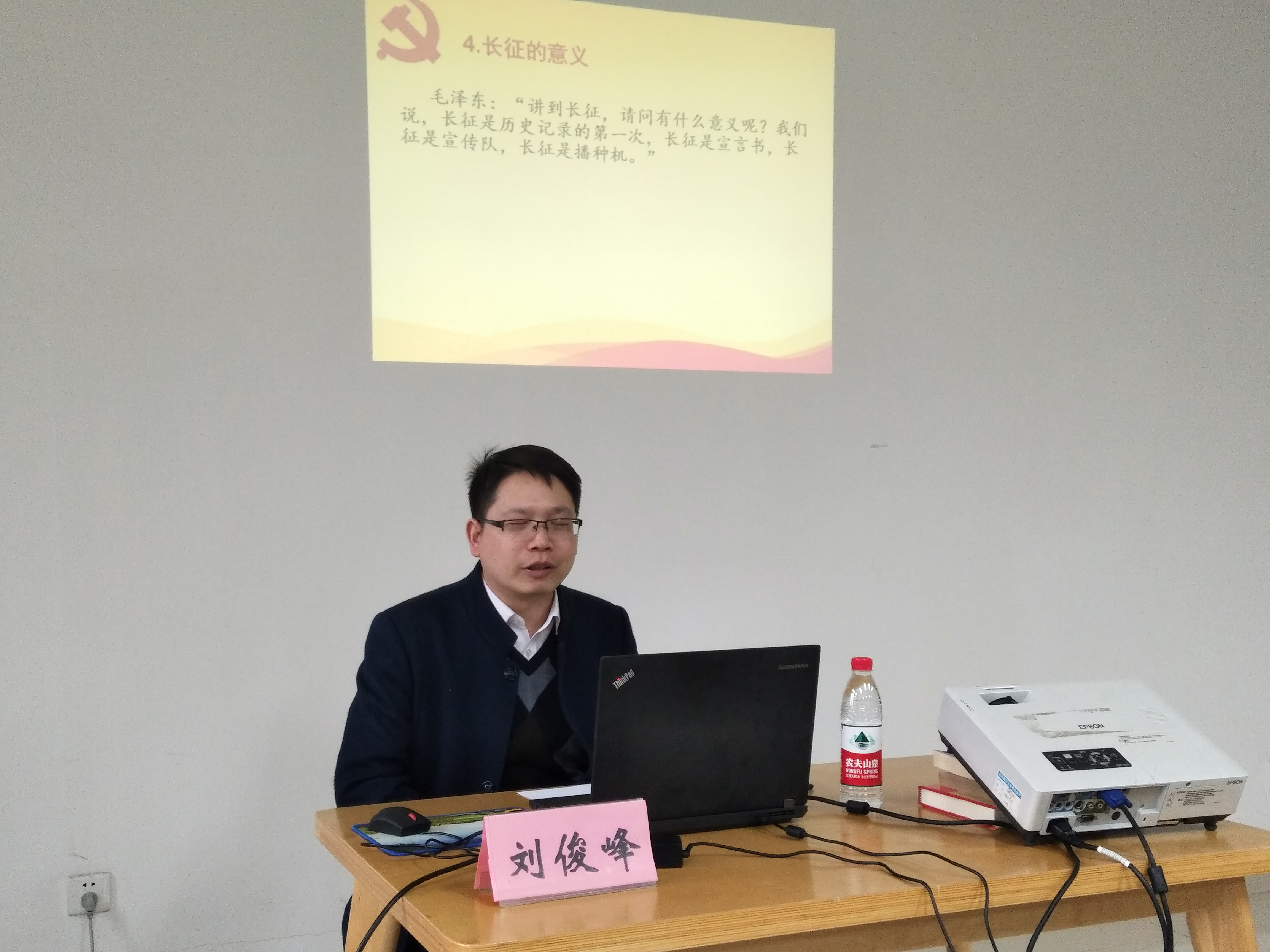 刘老师首先向大家讲述了长征的起因、经过及意义。其中重点讲述了长征途中包括血溅湘江、遵义会议、巧渡金沙江在内的几个重要事件。在他生动的讲解中,大家仿佛看到,80年前的红军在极端恶劣的条件下用双腿跨越了11个省,为革命反攻保存了力量,用他们的双肩扛起了中国民主革命的责任,让我们知道伟大的长征精神就是把全国人民和中华民族的根本利益看得高于一切,坚定革命的理想和信念,坚信正义事业必然胜利的精神。在场同学无不为之动容,心中都扬起了对红军战士的无限敬仰。随后,刘俊峰老师在弘扬长征精神的基础上,告诫我们要走好今天的长征路,“大学生应该做到学习历史,坚定信念,保持团结和坚持艰苦奋斗的精神。在物质条件有所改善的今天,在面对环境的变化时要牢记个人奋斗的价值。我们应为实现中华民族的伟大复兴而不懈努力,将红军长征留给我们的宝贵财富一代一代传下去。”