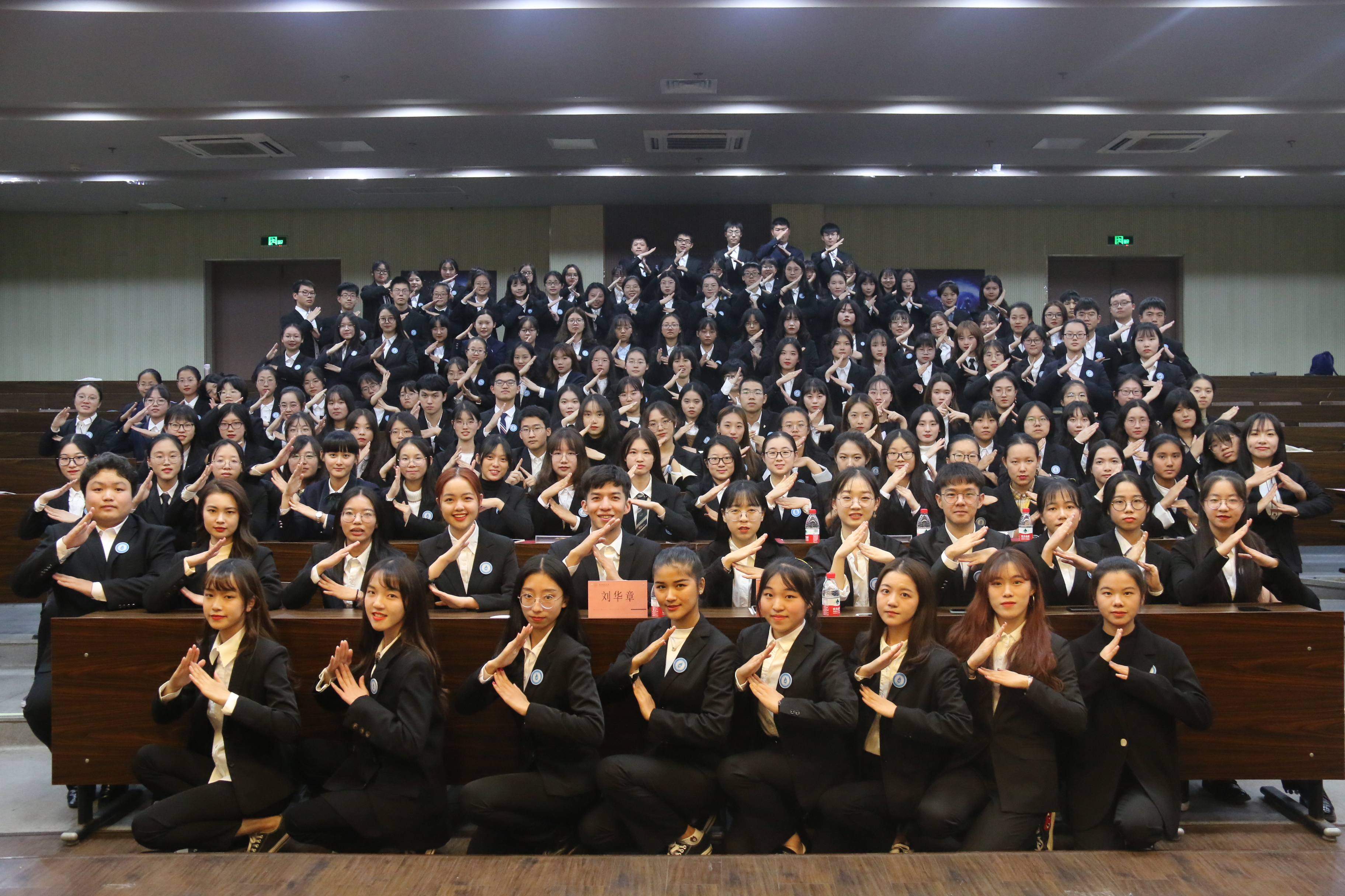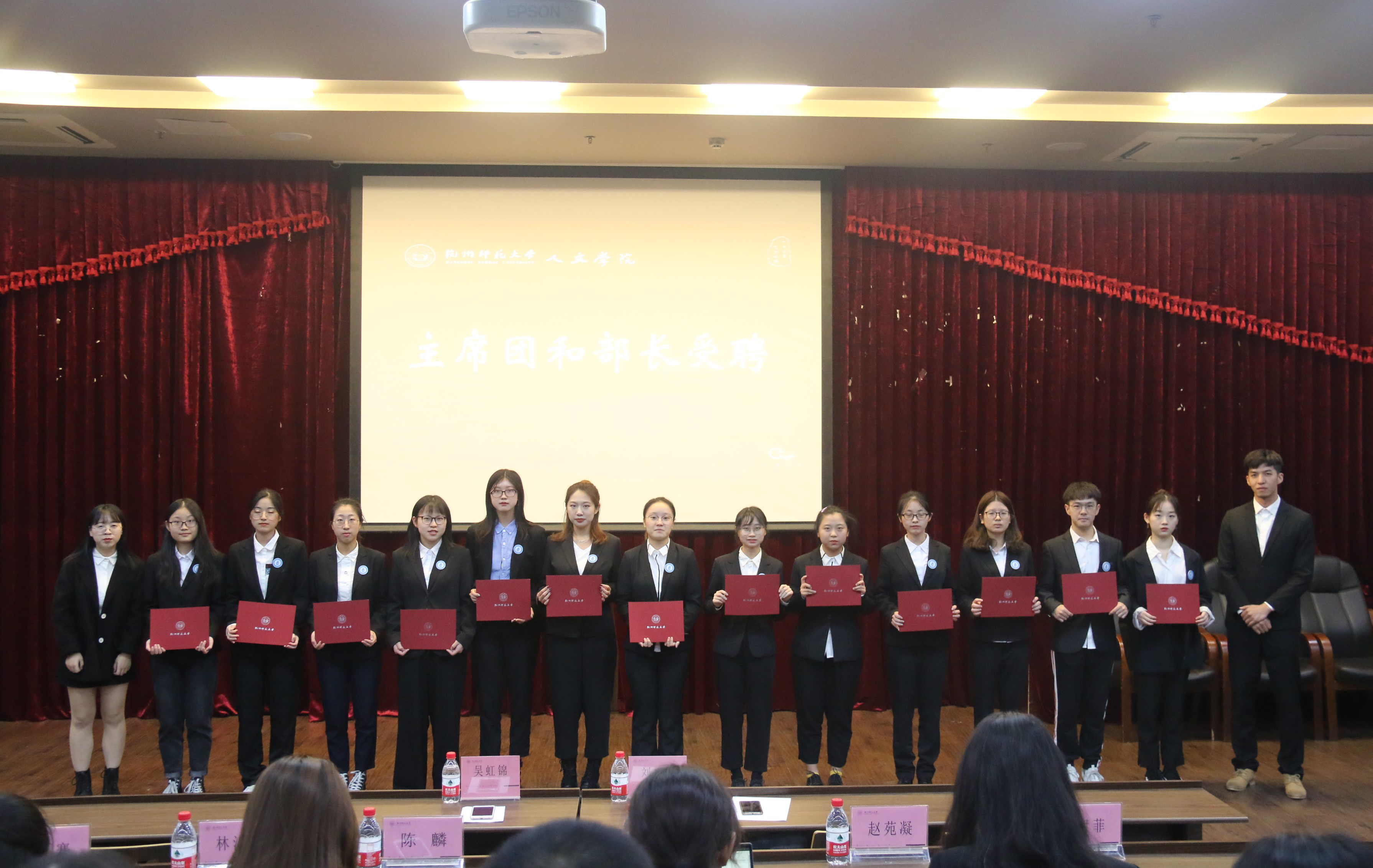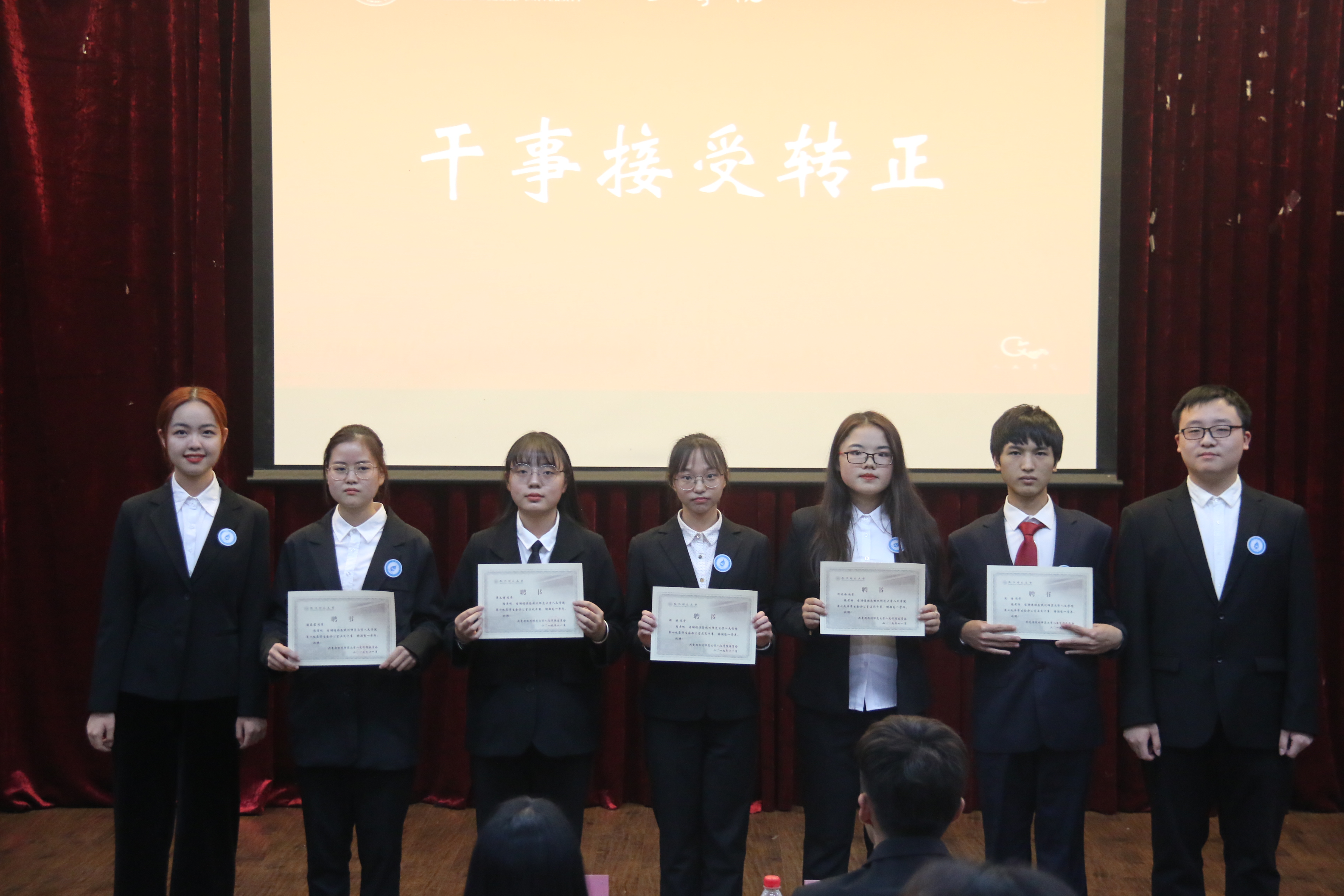 11月16号晚,女同av 第七届团委、第二届青年志愿者协会、第十九届学生会、第二届全媒体中心干事转正仪式暨主席部长受聘仪式于恕园23号楼弘毅厅顺利举行。女同av 团委老师刘华章老师应邀出席大会,女同av 团委学生会全体成员正装参加。