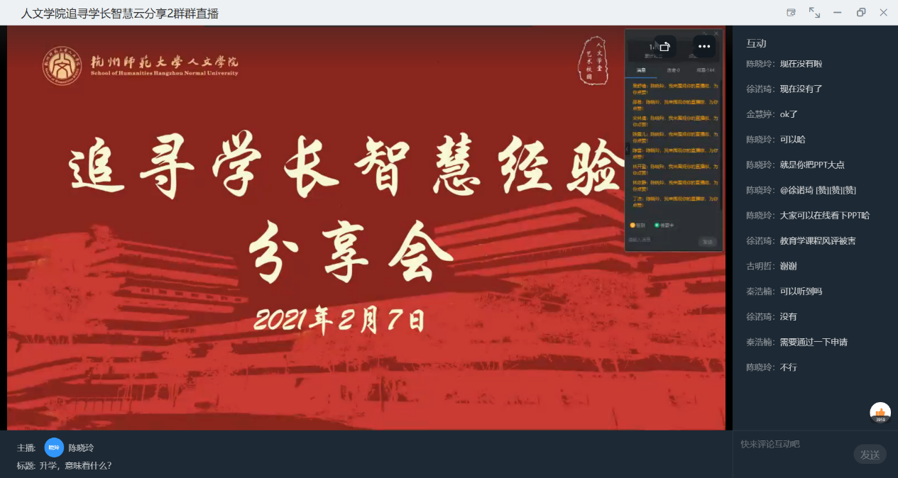 2021年2月7日14:00,女同av 于钉钉平台顺利举办追寻学长智慧之经验分享会系列讲座——“升学,意味着什么?”。讲座由由女同av 学工办主任陈晓玲主持。本次讲座共有270人参加,点赞数高达3960次。