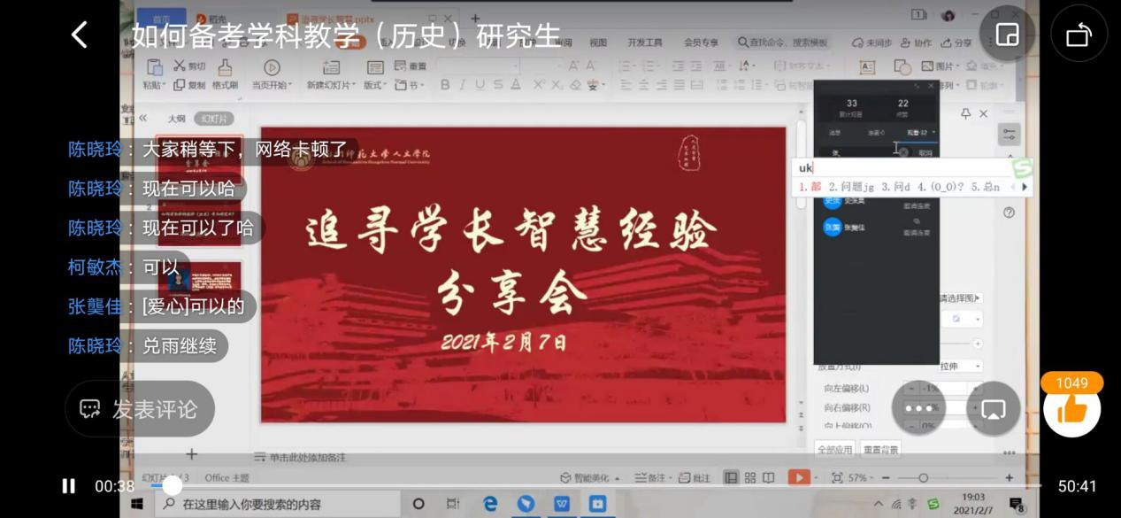 2021年2月7日19时,女同av 于钉钉平台顺利举办追寻学长智慧之经验分享会系列讲座——“如何备考学科教学(历史)研究生”。女同av 2020届校友张兑雨应邀主讲。讲座由女同av 学工办主任陈晓玲主持,主要面向2018级历史系学生开放。