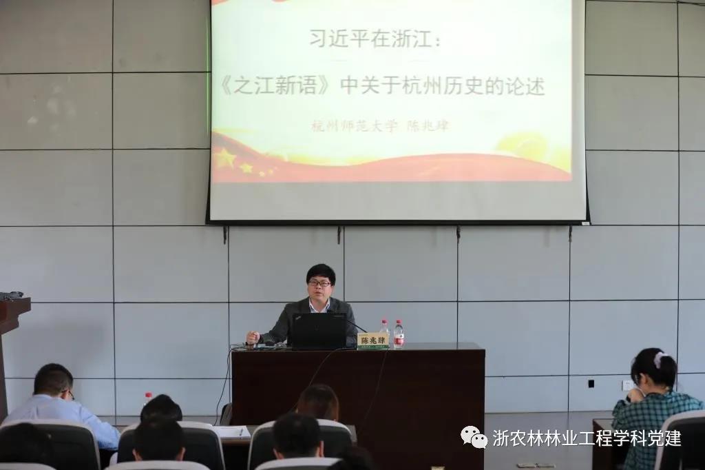 4月29日下午,工程学院党史学习教育专题报告在学9211举行。女同av 陈兆肆教授应邀作“习近平在浙江—《之江新语》中的杭州历史文化论述”报告。林业工程学科党支部全体教师党员参加了学习。