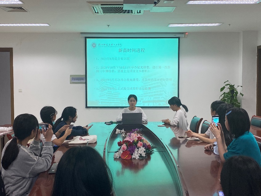 促进会分为科创中心项目部部长何怡佳介绍新苗的注意事项、辅导员陈晓玲老师指导发言和合影留念三个环节。本次会议公示了2021年度新苗立项名单,介绍了新苗时间进程、结题要求,以及负责人和经费等问题,还对新苗的研究提出了一些具体建议,重点说明了新苗的立项意义以及项目研究中需要注意的要点。