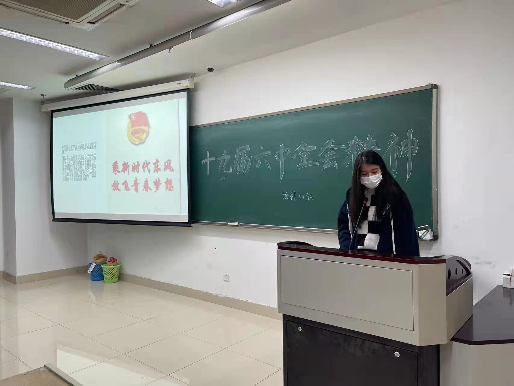 活动伊始,古丽菲亚向同学们简要讲述了党的十九届六中全会精神主要内容,并表示“作为一名大学生,深感责任重大、使命光荣。将‘永远以党的旗帜为旗帜、以党的方向为方向、以党的意志为意志’把青春奋斗融入党和人民事业,让自己成为实现中华民族伟大复兴的先锋力量。”
