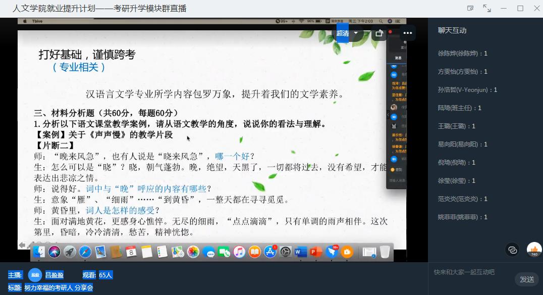 为进一步让女同av 学生明确考研目标,掌握相关考研技巧,了解更多相关信息,12月8日,考研经验分享会在线上钉钉举行,杭州师范大学钱江学院汉语言专业学生吕盈盈(现已顺利考取温州大学研究生)受邀担任主讲并分享了她的考研经验。