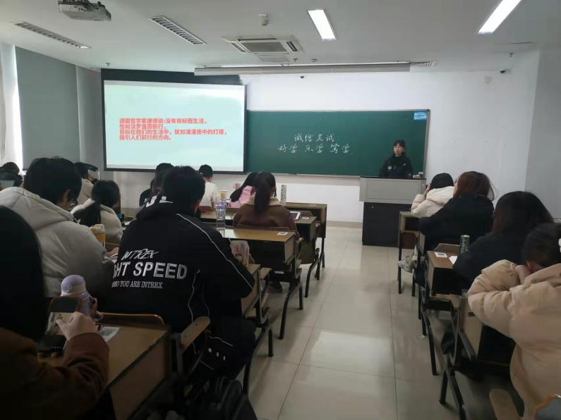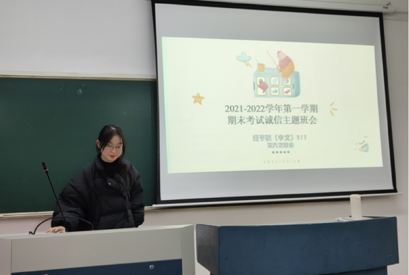 “诚信考试”主题班会强调坚持诚信的优良作风,保证考试的公平公正,将诚信考试落到实处。围绕这一主题,各班进行了各种丰富有趣的活动。例如,中文201班介绍了有关诚信的经典名言、列举了与诚信有关的成语故事,加深了同学们对诚信的认识;中文213班举行了郑重的诚信宣誓,营造了“内不欺己,外不欺人”的氛围;历史212班组织观看了发人深省的诚信教育短片,让同学们受益匪浅……正如历史201班班长杜文鑫所说:“常言道,人无信而不立,诚信是每个大学生应有的道德基础。对于当代大学生来讲,明礼诚信是立身处世之本,是走向社会的‘通行证’。”在平时的生活中,诚信是必不可少的;在考试中,诚信更是不容忽视的。