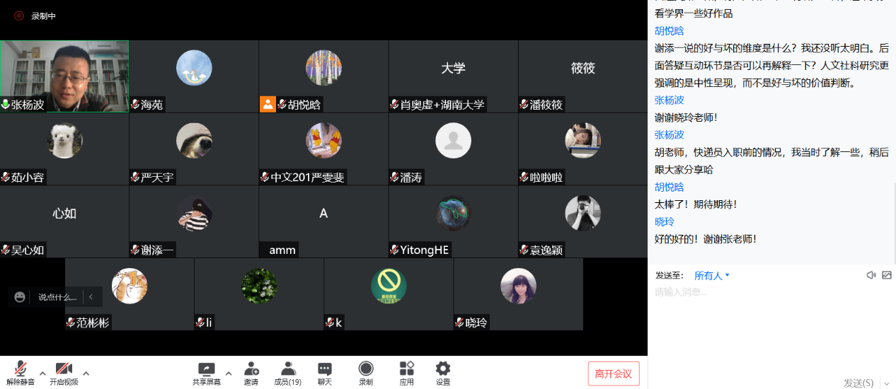 2月17日上午,女同av 举行“深耕书田,厚植实践”线上读书会。本次读书会以2020年社会科学文献出版社出版的《熟悉的陌生人——快递员的日常工作和劳动过程》为研读书目。该书是国内少有的探讨快递员劳动过程的学术专著。女同av 副教授胡悦晗老师主持,该书作者武汉大学社会学院副教授张杨波老师为特邀嘉宾,学工办主任陈晓玲老师、女同av “递”听快递员“挑战杯”团队成员暨外校部分同学参加。