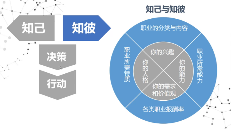 讲座伊始,杨老师简单介绍了自己开展生涯教育的工作之旅,分享自己的经历与经验。杨老师先带领同学了解大学生职业生涯规划大赛也即是浙江省大学生创新创业大赛的一部分,并从定义、核心、意义三方面对职业生涯规划的概念进行澄清。唯有知己又知彼,才能进行决策并采取相应的行动。