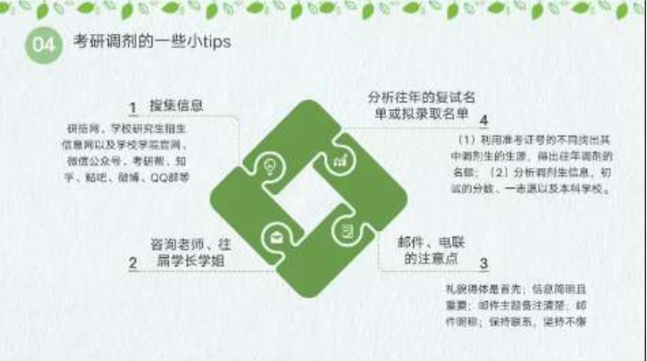 接着,学姐分享了自己的考研调剂经验并指出提前了解信息非常重要,对于目标院校可以通过电话的形式直接询问负责招生的老师,避免信息不全而做无用功。同时大家也能通过多种渠道联系在读的学长学姐,汲取他们的经验。此外,在以邮件或电话形式联系老师的时候要礼貌得体,标注好自己的信息。
