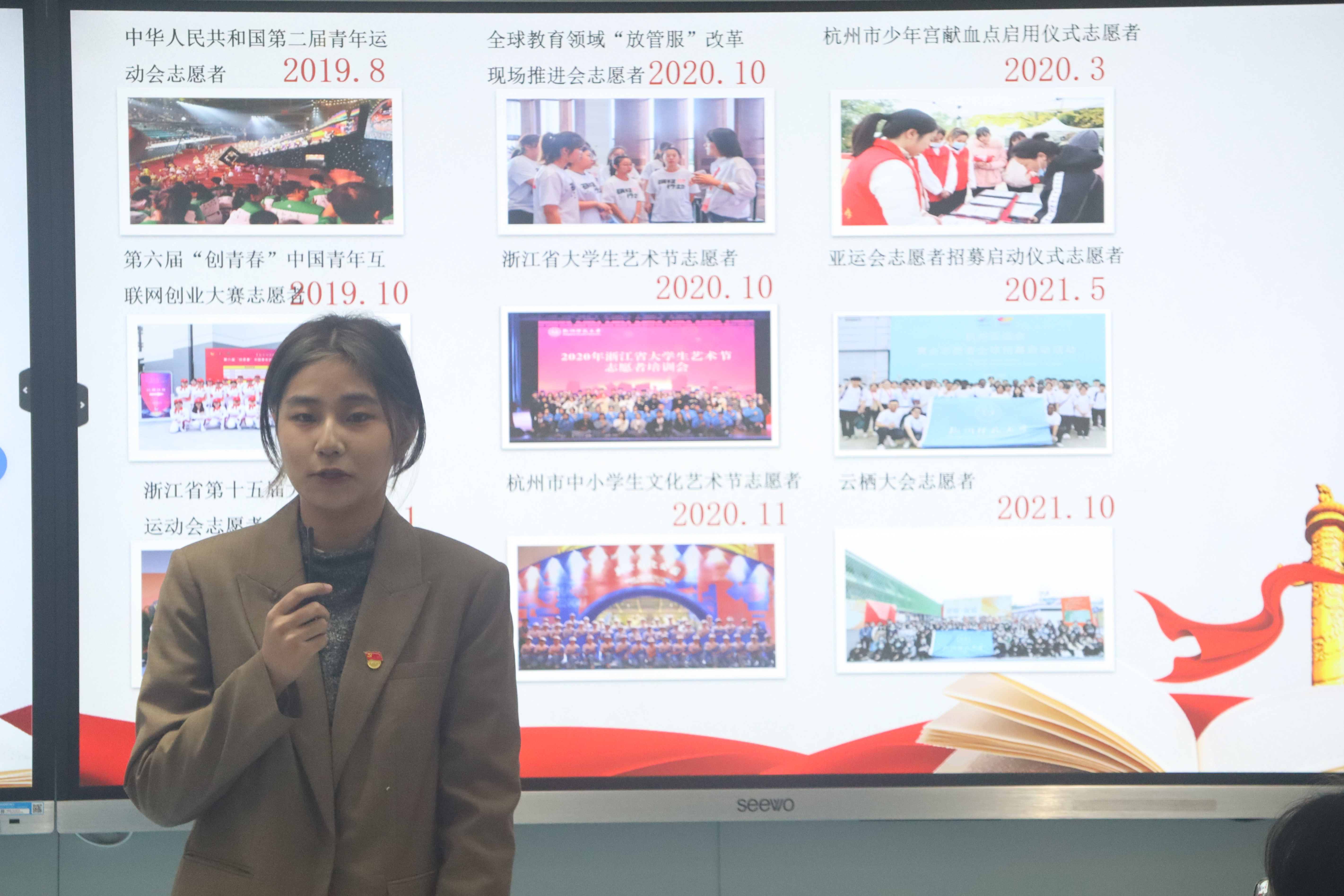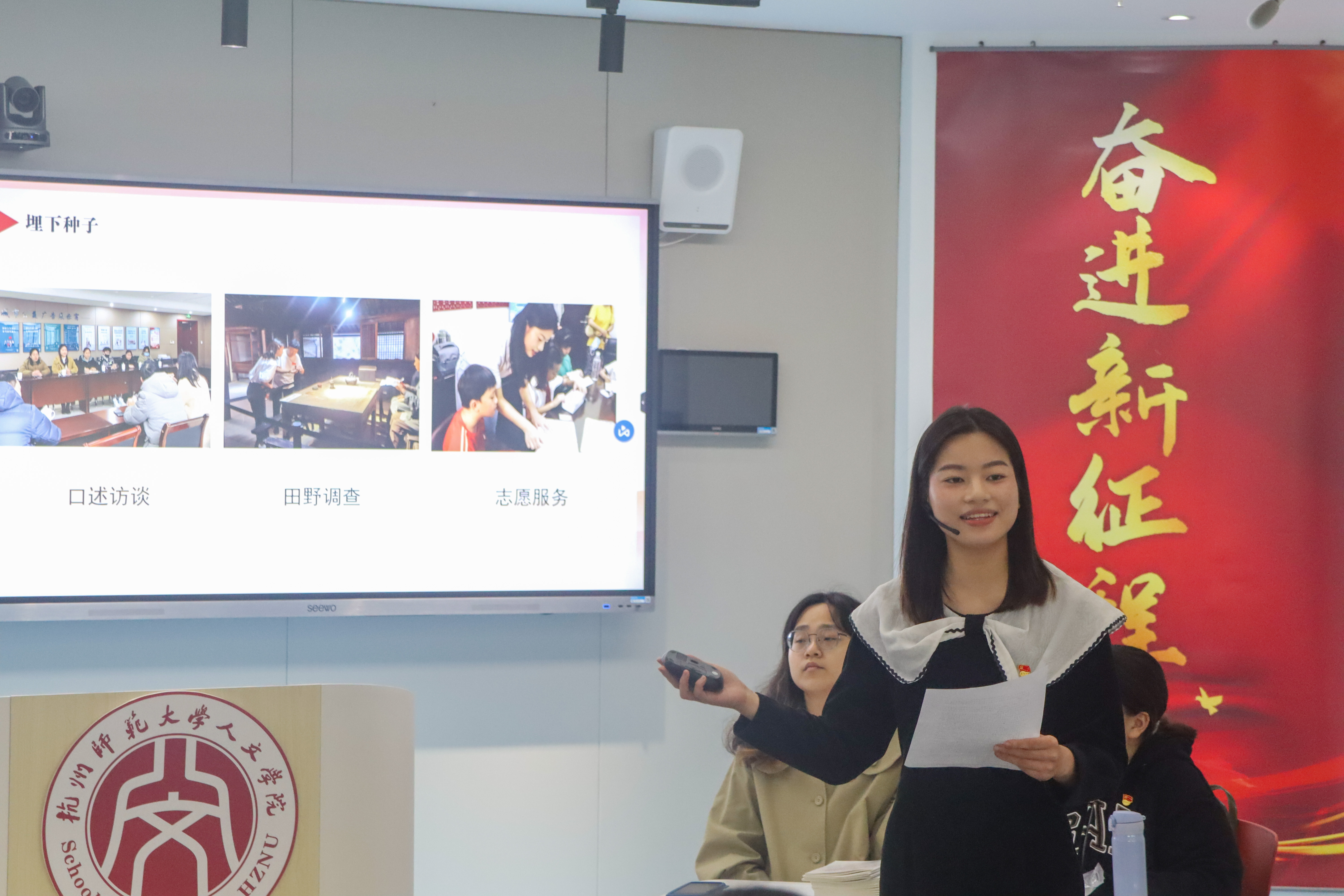 会议伊始,本科生第一党支部党员代表作了党的二十大精神学习专题报告。本科生第一党支部学生党员陈佳滢作为杭州师范大学“耕远”文化团队负责人、杭州市金牌宣讲员,结合自己带领“耕远”文化团队和“莓美与共”实践团队口述访谈、田野调查、志愿服务等的具体实践,详细阐述了她对习近平总书记在党的二十大报告中关于当代中国青年相关论述的理解。曾任杭州师范大学青年志愿者协会会长、获得“浙江省优秀共青团员”称号的本科生第一党支部学生党员殷沁雅结合自身志愿服务经历,分“以青春之我担时代之任”、“以奋斗之姿与时代逐梦”、“以青春梦想书写新时代篇章”三部分论述了自己对习近平总书记在党的二十大报告中对新时代青年寄语的理解,进一步呼吁广大青年“让青春在全面建设社会主义现代化国家的火热实践中绽放绚丽之花”。