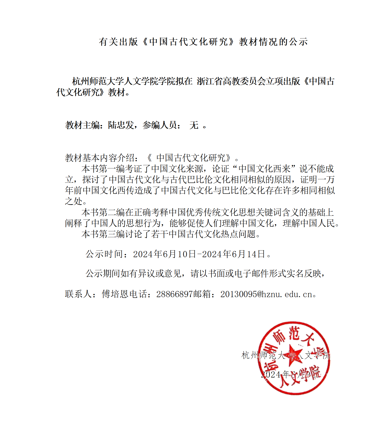 有关出版《中国古代文化研究》教材情况的公示