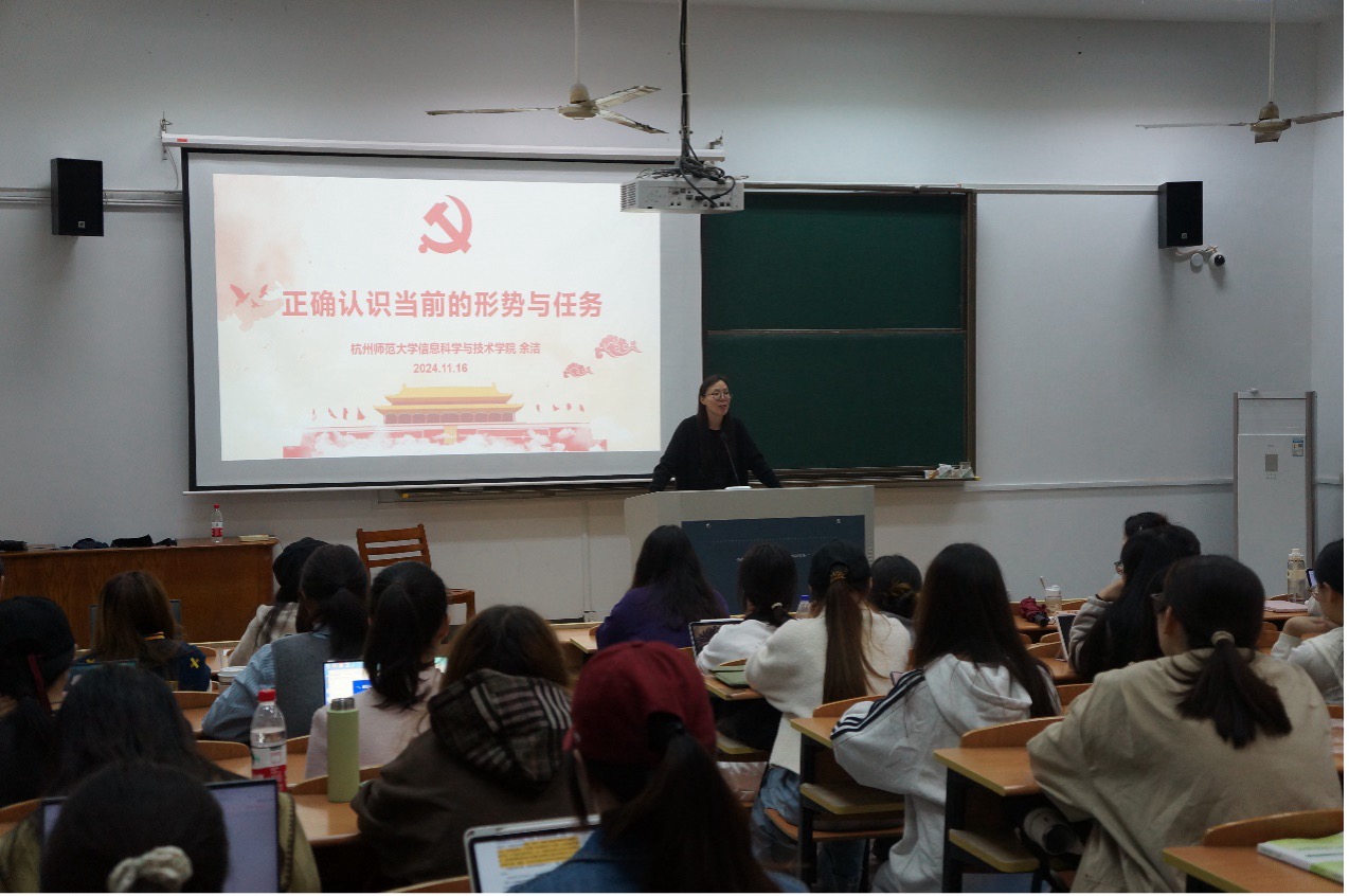 11月16日晚,余洁老师在下沙C-102教室面向全体积极分子和发展对象,展开《正确认识当前的形势与任务》的党课培训。余老师将过去“为什么能?”、现在“应怎么看?”、未来“该如何干?”三个问题作为总体叙述脉络,用深入浅出的例子对当前的形势与任务进行了细致的讲解。回顾过去,余老师回顾了过往我国在经济、科技、文化等多领域取得的举世瞩目的成就,例如脱贫攻坚的伟大胜利让数以亿计人口摆脱贫困,这些成就彰显了我国制度优势与民族凝聚力,为应对当下形势奠定了坚实基础。着眼现在,余老师通过对国际政治格局的动态变化分析,如美国总统选举背后权力集团的更替,引导学员们用辩证思维看待当下复杂形势,深刻理解机遇与挑战并存的现状。放眼未来,余老师鼓励积极分子和发展对象们要拓宽自己的眼界,通过积极参加科研竞赛、担任学生干部等途径锻炼自己,走出舒适区,以实际行动践行初心使命,在时代浪潮中书写属于自己的精彩篇章。