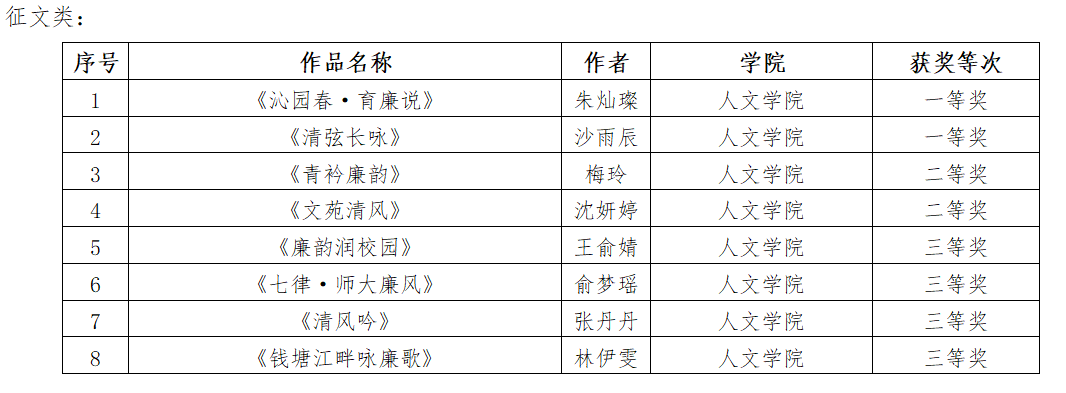 自2025年1月活动启动以来,女同av 积极响应、广泛动员,组织学生围绕廉洁主题开展多样的创作。活动涵盖“清正述廉”校园诗词创作、“清心视廉”诗词视频征集、诗词廉洁实践课及诗词廉洁微课堂四大类别,共征集各类作品90余件。值得注意的是,学院结合专业特色与学生特点,创造性地设立“廉洁课堂实践作品”形式,成为全校唯一在该类别中获奖的单位。2025年4月,经学院初步评审,共推选56件优秀作品至学校参赛。2025年10月,在学校层面的评选中,女同av 共有11件作品脱颖而出。在征文评比中,朱灿璨、沙雨辰荣获一等奖,梅玲、沈妍婷荣获二等奖,王俞婧、俞梦瑶、张丹丹、林伊雯荣获三等奖。在课堂实践类评比中,叶慧仪荣获一等奖,曹颖荣获二等奖,周皖、张至兰荣获三等奖。