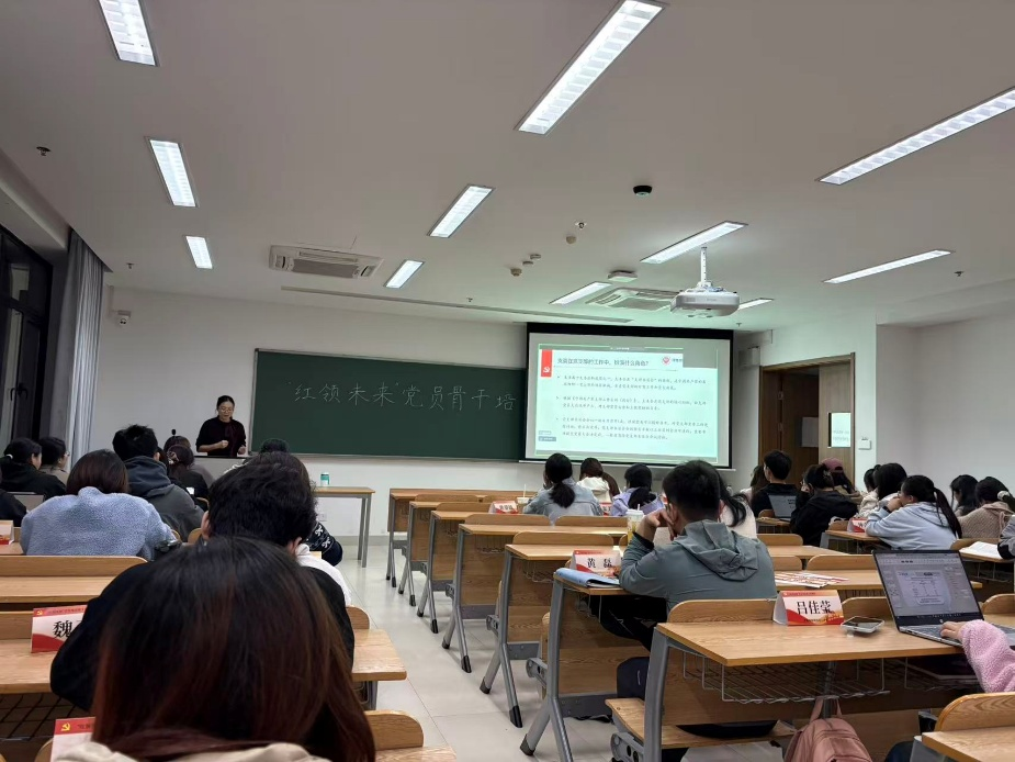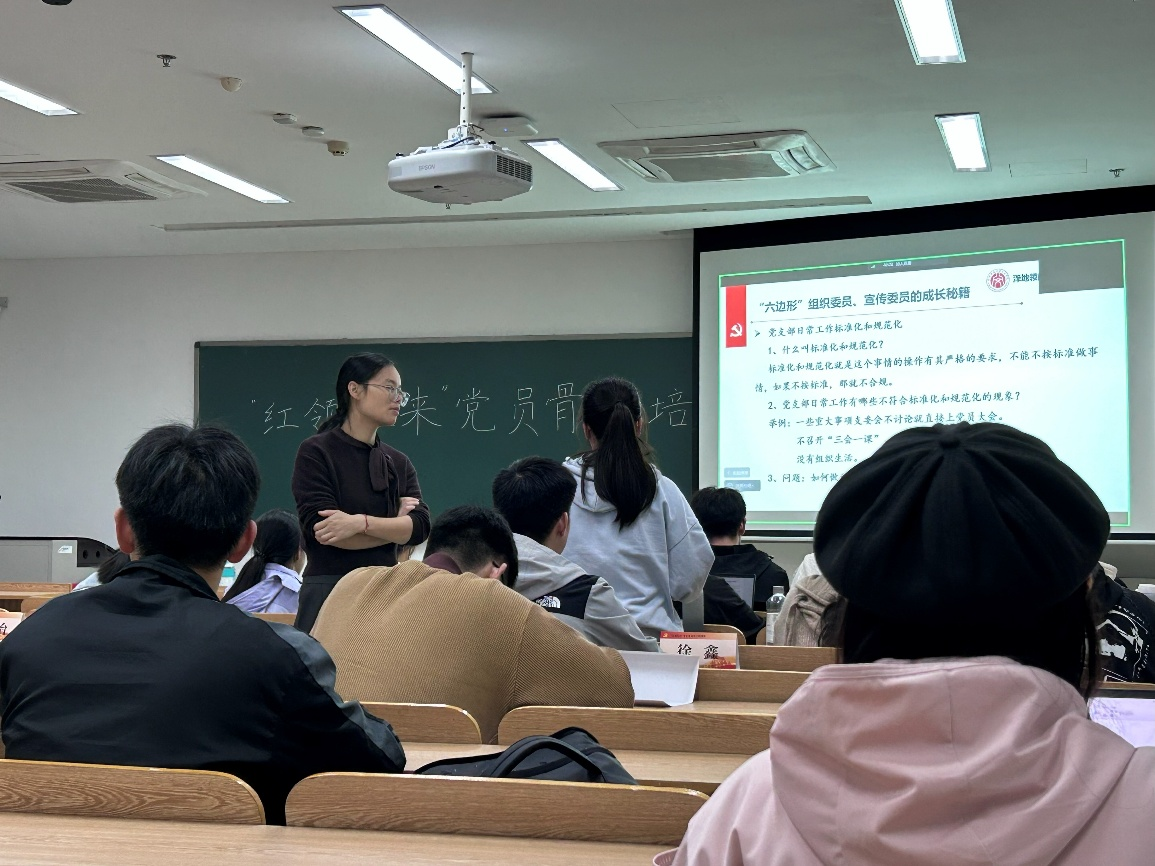 2025年11月9日晚,我校“红领先锋”学生党员骨干培训营第二讲在勤园6号楼409教室顺利举行。本期培训以“支委如何在支部工作中唱主角”为核心主题,女同av 专职组织员陈晓玲担任主讲,来自各学院的70余名学生党员骨干齐聚一堂,共同开启了一场关于角色、责任与担当的思想盛宴。